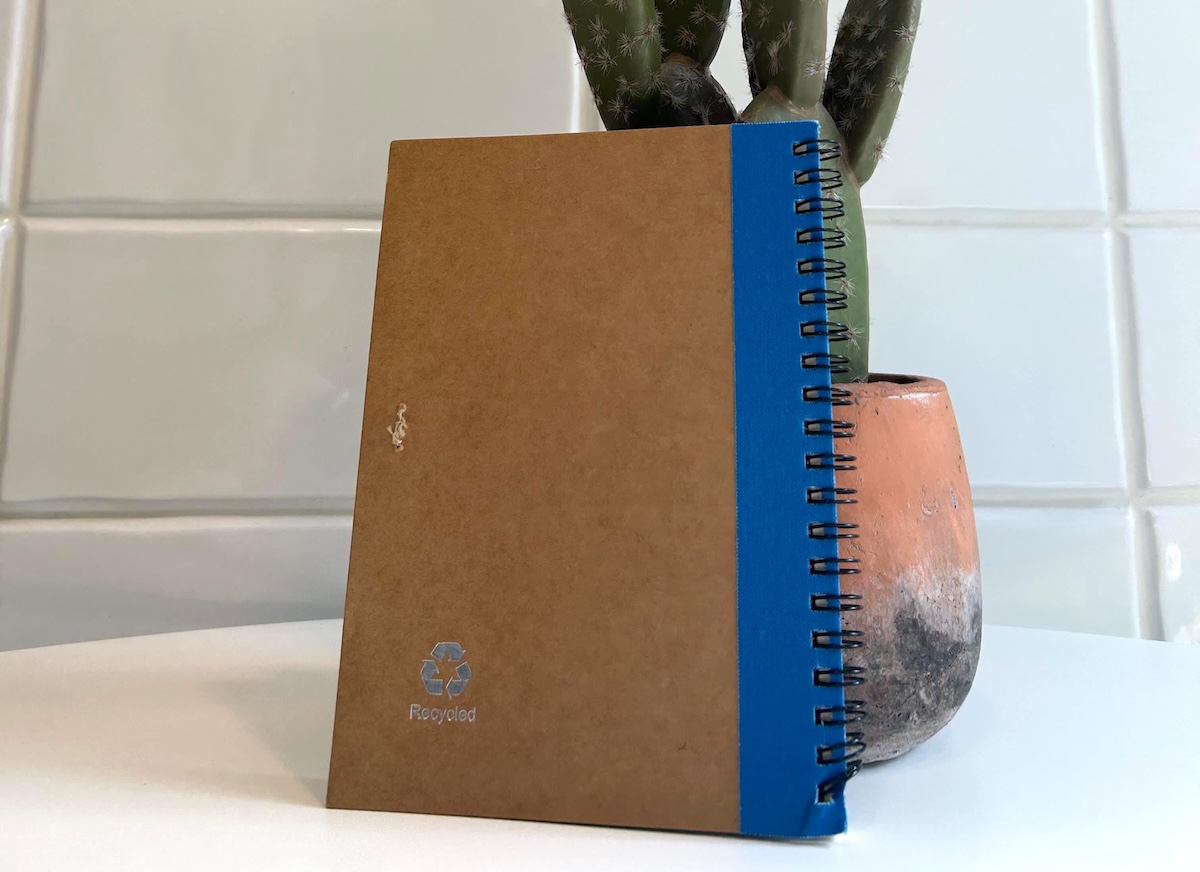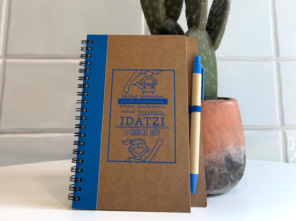 Oharren blocka, kartoi estalki arautua, paper birziklatuko 60 orri lisorekin (euskarazko testua), boligrafoa barne. 130 x 177 mm.